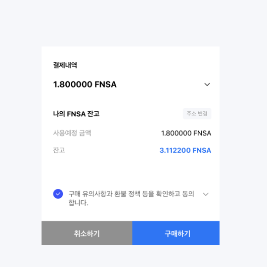3) 나의 FNSA 잔고를 확인한 후 구매하기 버튼을 누르면 완료!
