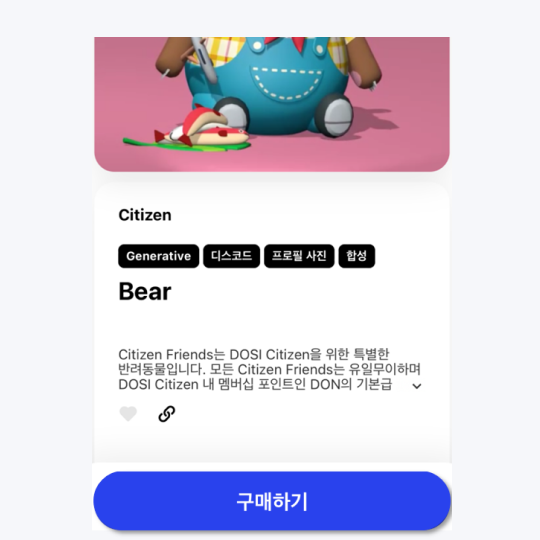 1) DOSI 앱 내 ‘마켓’ 탭에서 원하는 디지털 아이템을 선택하고 ‘구매하기’ 버튼을 눌러 주세요.