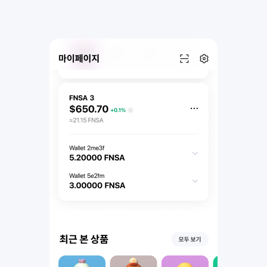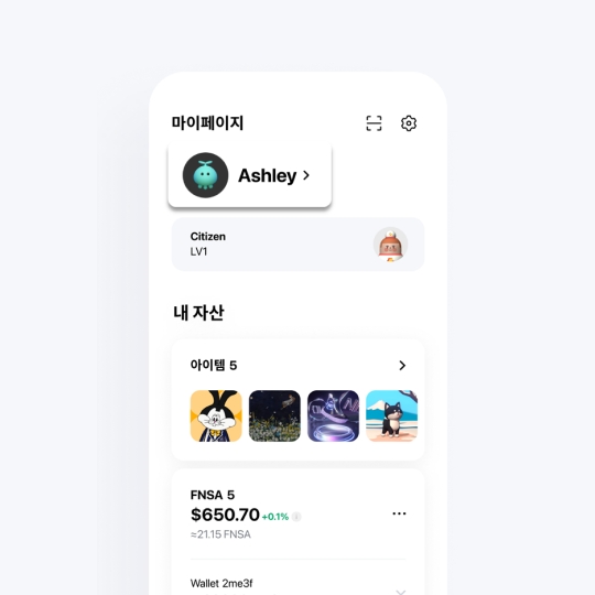 3) 모든 절차가 완료되었습니다! 마이페이지 메인 화면에서 추가된 기존 FNSA 지갑과 나의 자산을 확인하세요.
