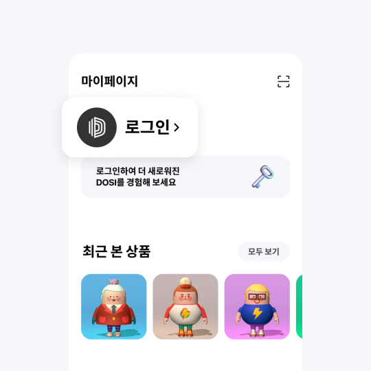 1) DOSI 앱 내 ‘마이 페이지’ 탭에서 로그인 버튼을 선택하고 신규 계정을 생성하시거나 기존 가입된 DOSI 계정으로 로그인해 주세요.