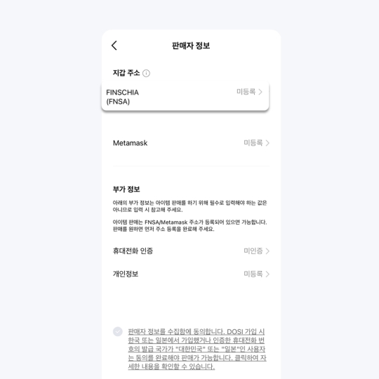 ※한국 또는 일본 국가 사용자의 경우 ‘판매자 정보 수집 동의’와 함께 판매자 정보 영역의 모든 정보 (휴대폰 번호, 개인정보)를 필수로 입력해야 판매자 권한 획득이 가능합니다. ※이더리움 정산을 위해서는 Metamask 지갑 주소 등록이 필요합니다.