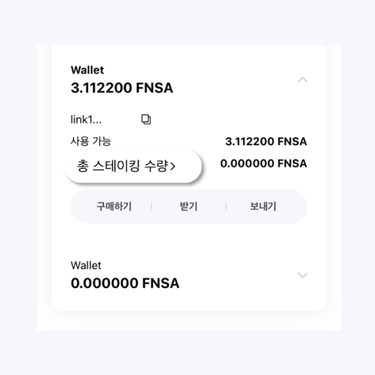 1) DOSI 앱 내 ‘마이 페이지’ 탭에서 스테이킹을 원하는 FNSA 지갑을 선택 후, ‘총 스테이킹 수량 >’ 버튼을 눌러 주세요.
