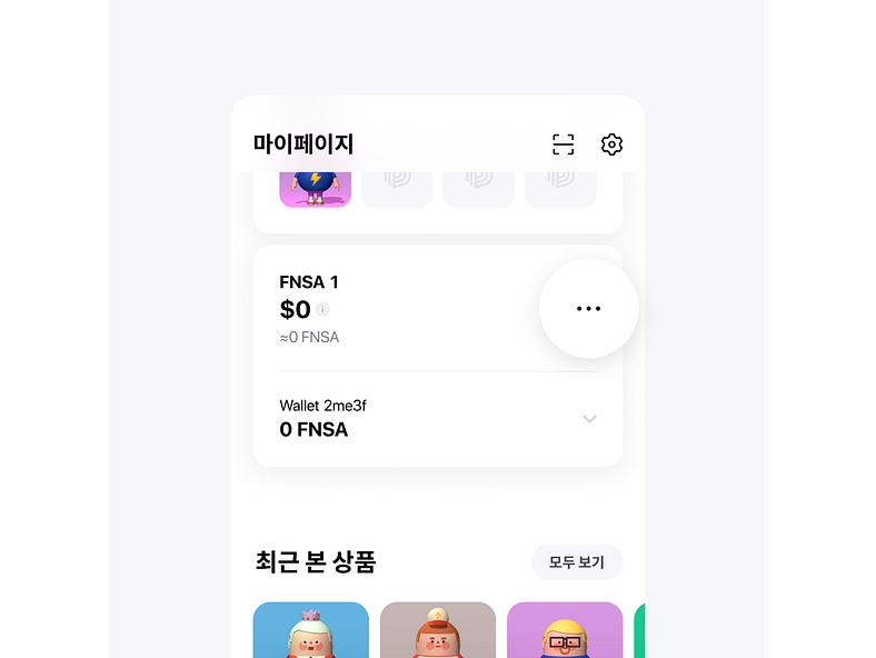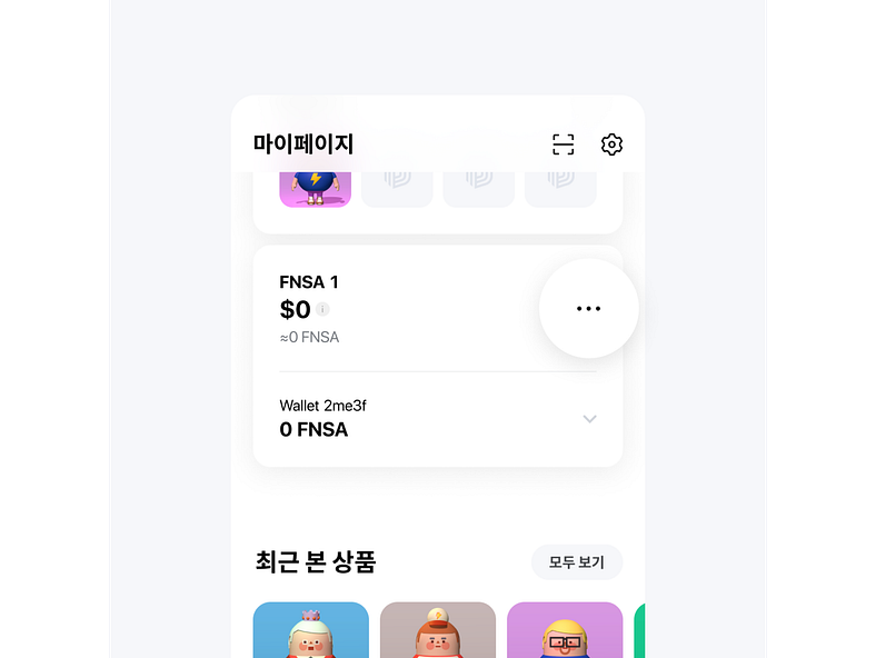 1) 신규 FNSA 지갑을 생성한 후, ‘마이 페이지’ 메인 화면의 보유 중인 FNSA 영역 우측 더 보기 (···) 버튼을 선택하여 ‘내 지갑 목록’ 화면으로 진입합니다.
